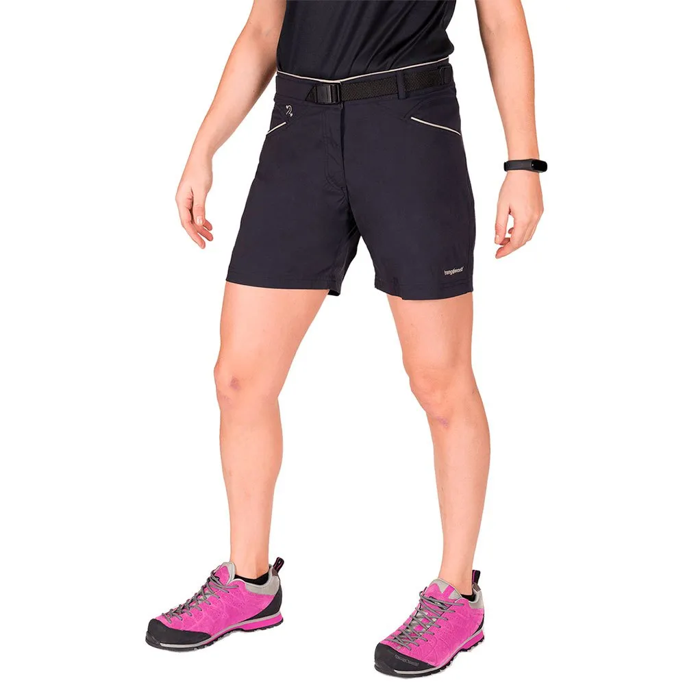 Waistband with belt and interior adjustable elastic band. Side pockets.